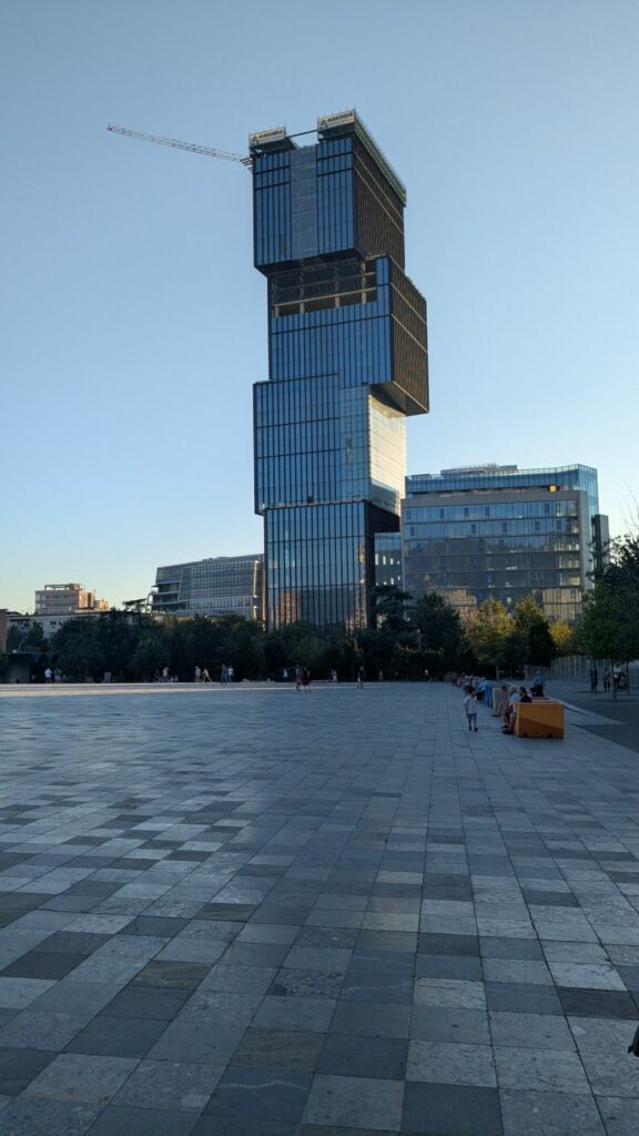 Skanderbeg-Platz: ein ganz markanter, riesengroßer Platz, Auto-frei! Hier steht das namensgebende Skanderbeg-Denkmal. Der Platz markiert das Zentrum von Tirana und wird durch den Neubau eines Hochhauses, das von der Seite Skanderbegs Profil zeigt, nochmal mehr in die Mitte gerückt. Auf der Seite des Tourismusverbandes gibt es mehr Infos dazu.